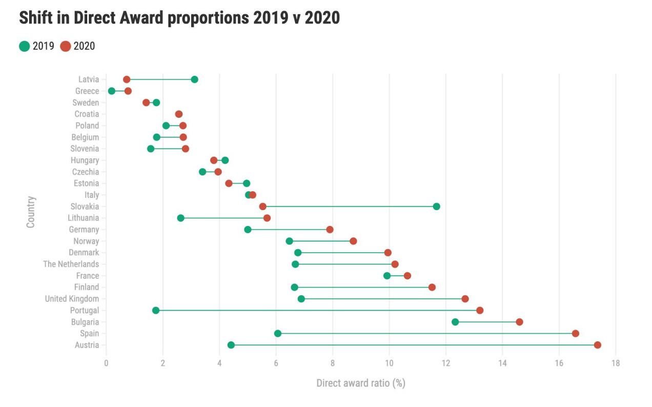Tracking competition in Europe: In a new report, Spend Network and They Buy For You analyze over 100 million rows of tenders, contracts, and spend throughout Europe to assess COVID-19-related procurement and identify trends, patterns, and outliers. One insight: While direct awards were on the rise, some countries such as Latvia and Slovakia appear to have used competitive procedures throughout.